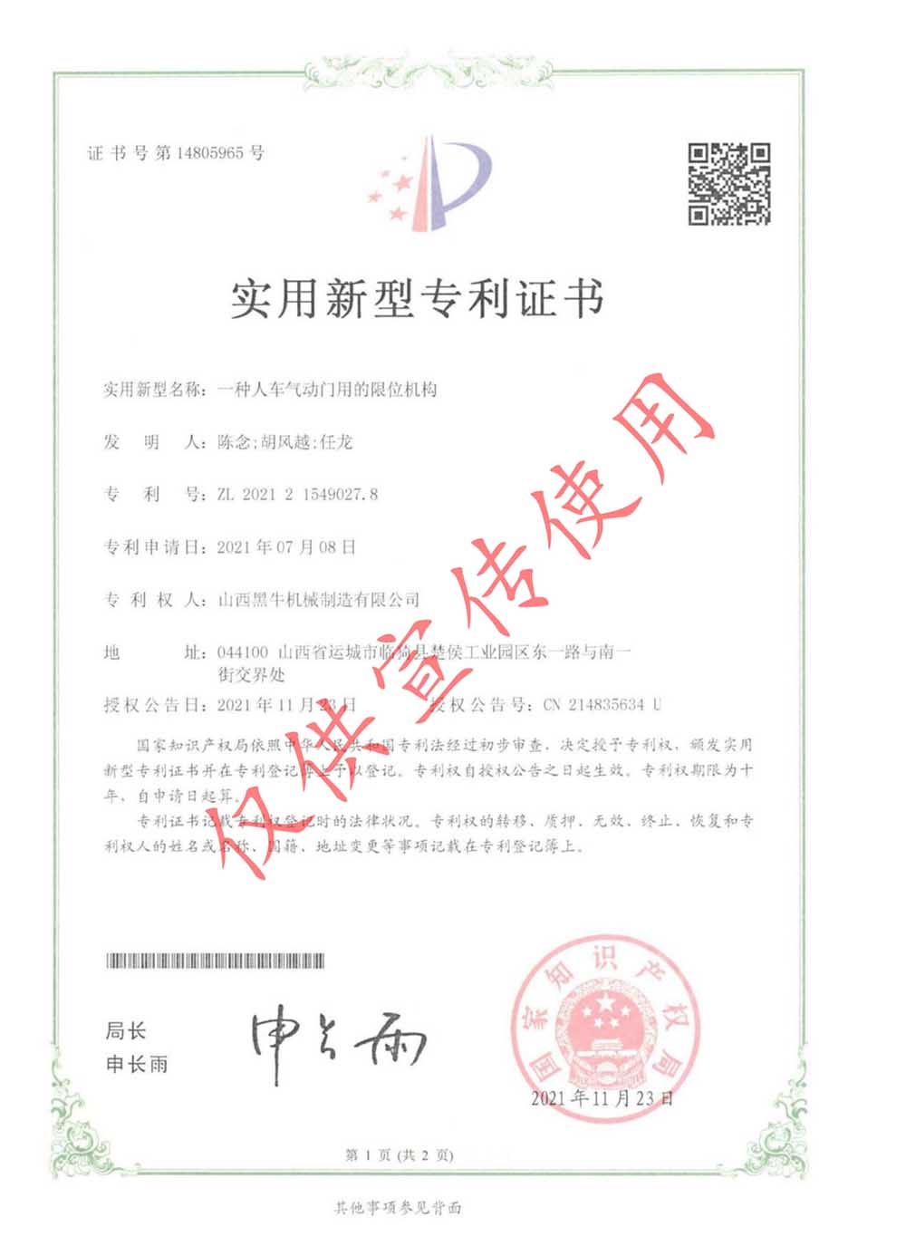 實(shí)用型專利證書(shū)
