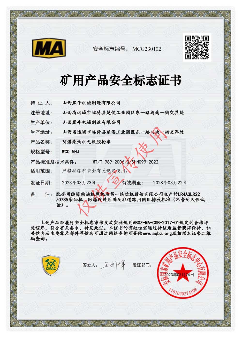 資質(zhì)證書 >車輛礦用產(chǎn)品安全標(biāo)志證書>WC0.5HJ