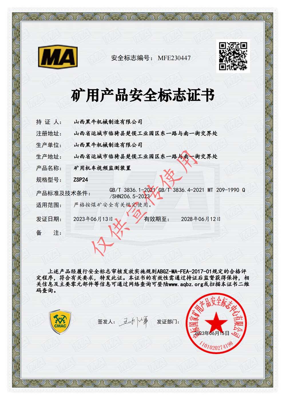 資質(zhì)證書 >視頻監(jiān)控裝置安標(biāo)證>礦用機(jī)車視頻監(jiān)測裝置
